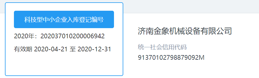 根據(jù)《科技型中小企業(yè)評價辦法》(國科發(fā)政〔2017〕115號)和省科技廳《關于開展2020年科技型中小企業(yè)評價工作的通知》等文件有關規(guī)定,現(xiàn)認定濟南金象機械設備有限公司成為“國家科技型中小企業(yè)”,編號:202037010200006942。
